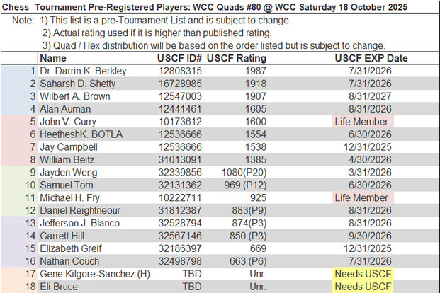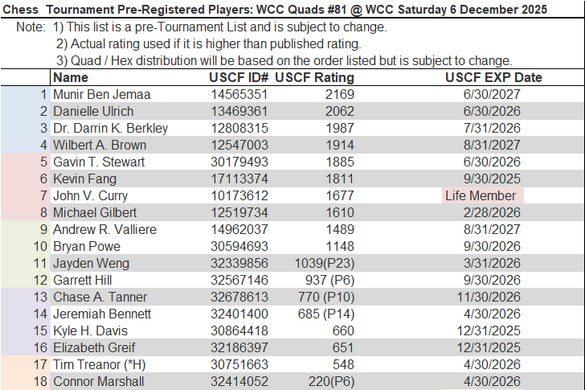 In all cases for on-line entry, please leave an email with the name and USCF ID of the tournament entrant so that I can add to the pre-registration list.